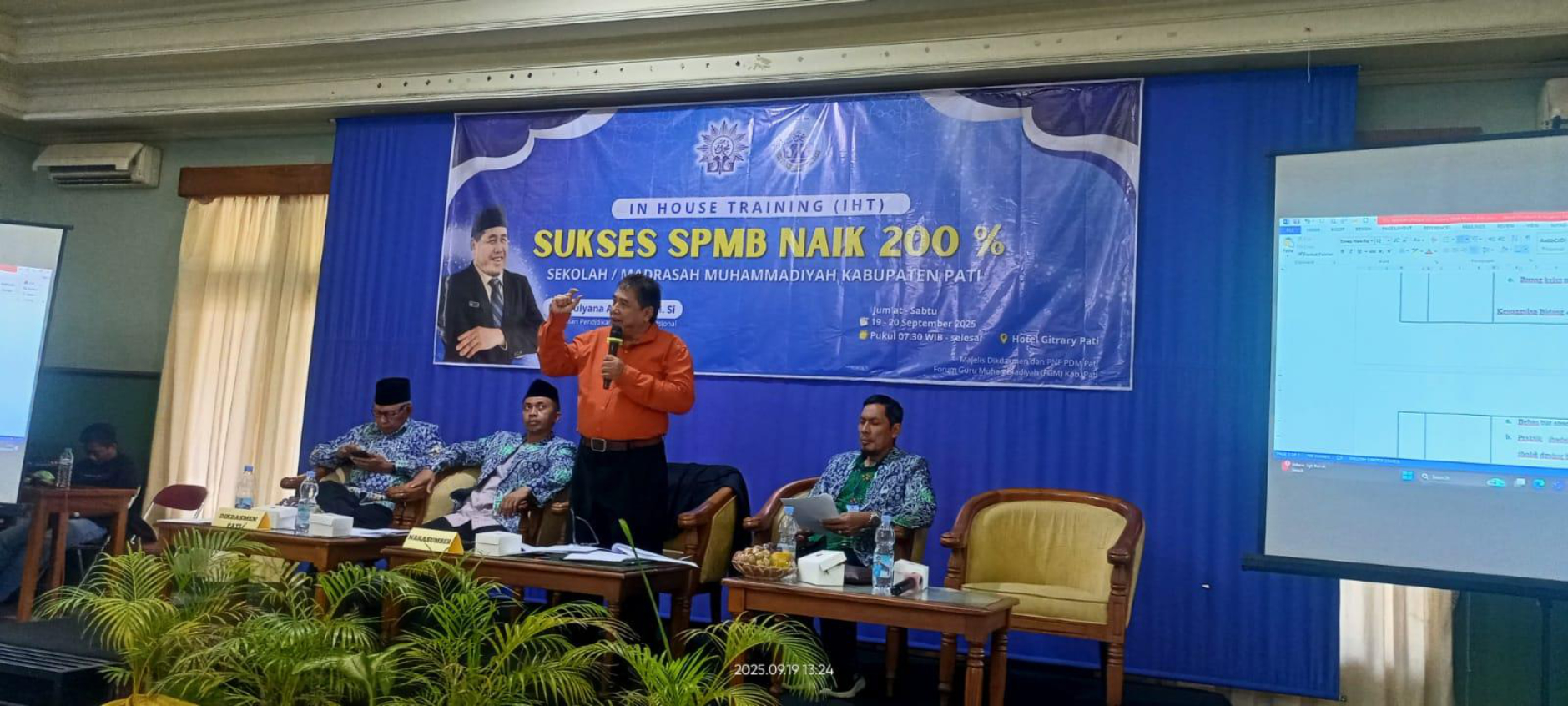 Semangat Panitia melalui Forum Guru Muhammadiyah (FGM Pati) menyambut 113 insan pendidikan Muhammadiyah se- Kab Pati yang berkumpul di Ruang Arimbi Hotel Gitrary Pati Jumat-Sabtu (19-20 September 2025)